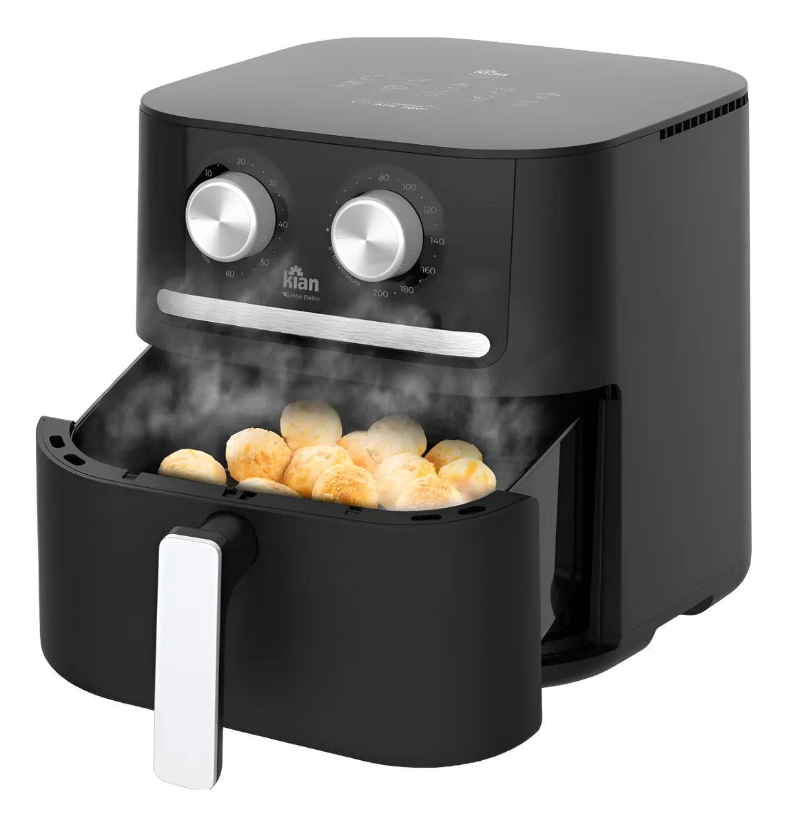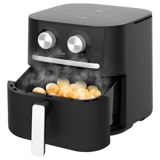 A Air Fryer Kian AF-106 utiliza tecnologia avançada de circulação de ar quente, que cozinha os alimentos por igual, garantindo crocância por fora e maciez por dentro, com até 85% menos gordura que as frituras tradicionais.