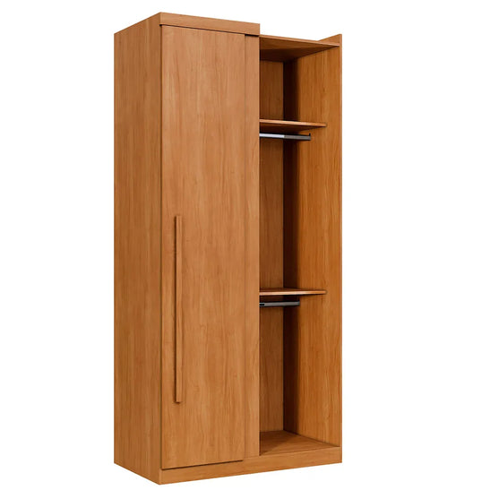 O destaque fica por conta do cabideiro em alumínio, que garante resistência, durabilidade e um toque de sofisticação, perfeito para manter suas peças penduradas e livres de amassados. Os puxadores amadeirados, além de reforçarem o acabamento elegante do móvel, oferecem um toque de charme rústico e aconchegante, combinando com diversos estilos de decoração. Para completar, as portas com fechamento suave proporcionam uma experiência de uso mais silenciosa e confortável, evitando impactos e aumentando a vida útil do móvel.