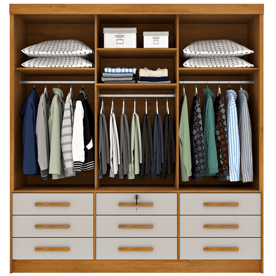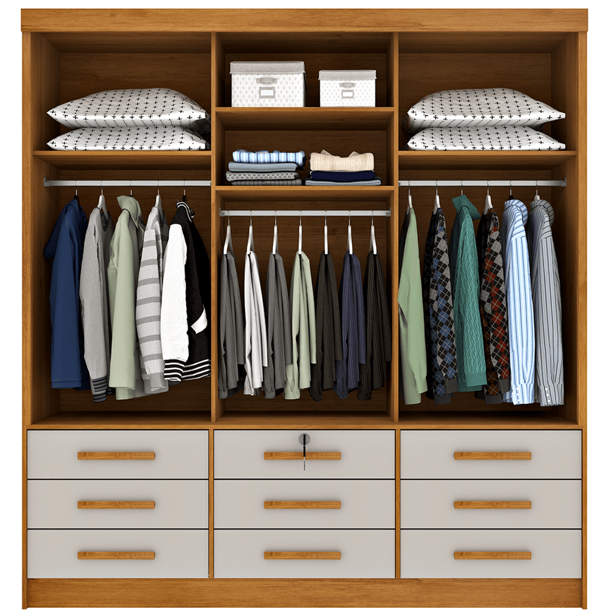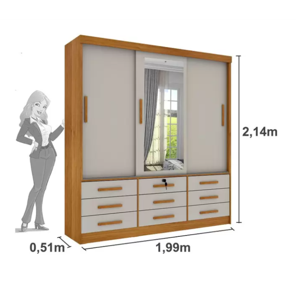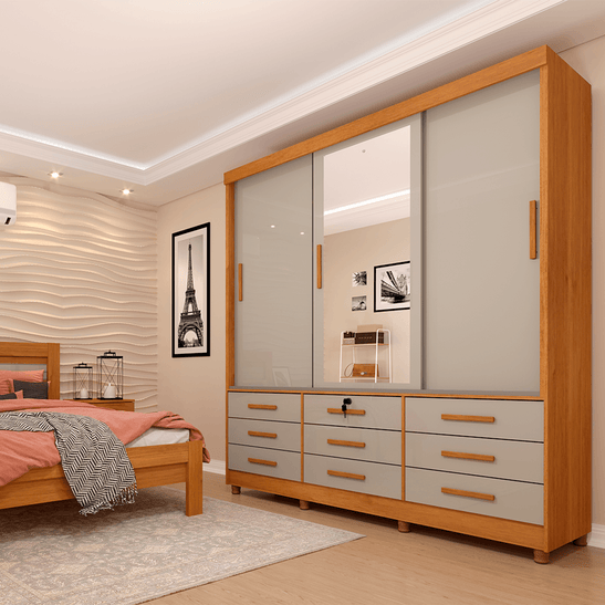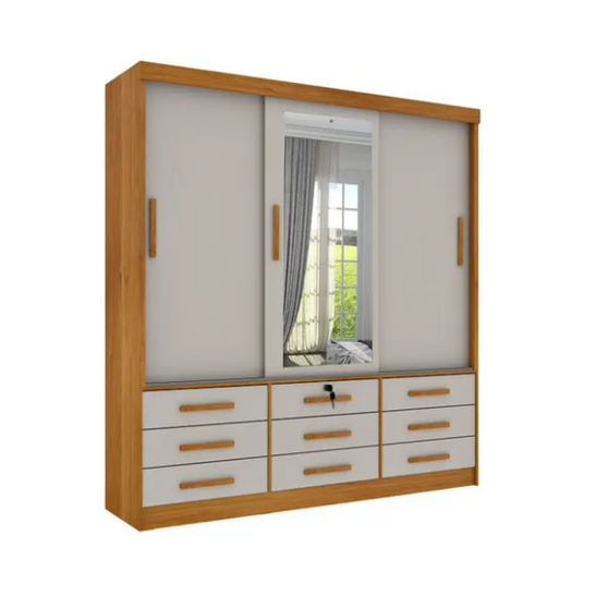 Roupeiro Chicago 3 Ptas Correr e 9 Gavetas Cinamomo/Off White S/Pés S/Espelho Tcil